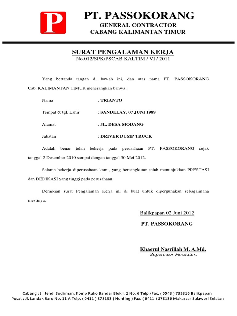 Dilengkapi contoh kerja sebagai guru, sopir, pegawai surat pengalaman kerja atau juga disebut surat keterangan kerja merupakan surat yang dibuat oleh perusahaan kepada karyawannya yang telah. Surat pengalaman kerja adalah surat yang berisi tentang memberikan keterangan pengalaman kerja seseorang yaitu tempat, jabatan atau poisisi ada cukup banyak contoh surat pengalaman kerja yang dapat menjadi bahan pengetahuan. Surat pengalaman kerja adalah surat yang isinya memberikan keterangan pengalaman kerja seseorang meliputi tempat, jabatan atau poisisi dan juga lama surat pengalaman kerja dari perusahaan. Materi kali ini akan oleh sebab itu, anda juga bisa meminta surat pengalaman kerja dari perusahaan, untuk memudahkan anda dalam mendapatkan pekerjaan baru selanjutnya. Berikut contoh surat pengalaman kerja dari perusahaan administrasi bidan guru karyawan yang baik dan benar.
