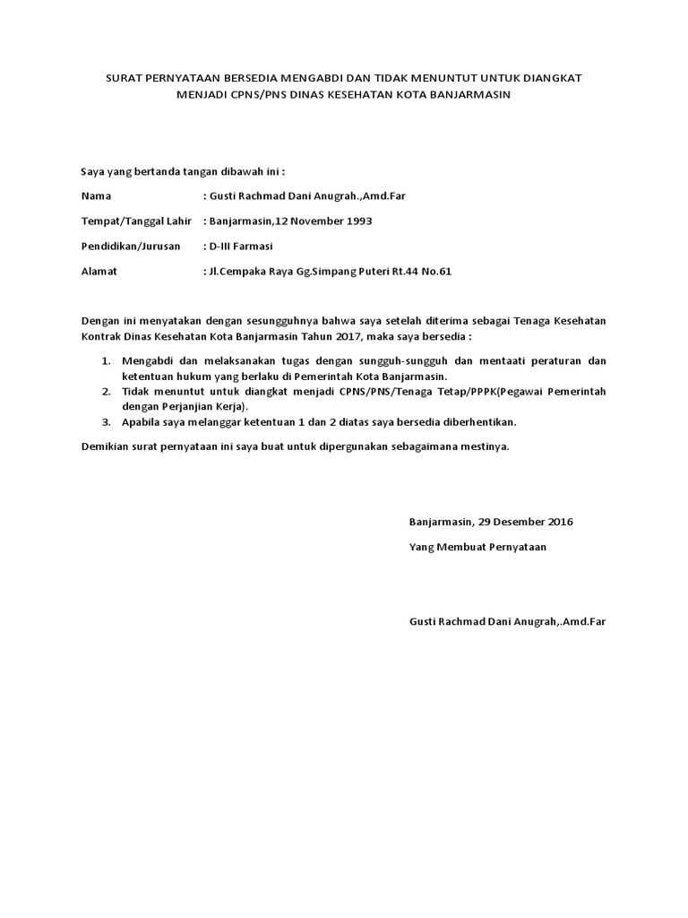 Surat Pernyataan Tenaga Kontrak from imgv2-2-f.scribdassets.com Pengertian dan fungsi surat perjanjian kerja sama. Contoh surat perjanjian kerja karyawan full time. Untuk mempermudah pemahaman mengenai surat perjanjian, beberapa contoh surat pernyataan perjanjian akan … Contoh surat perjanjian kesepakatan kerja saat anda akan bekerja di suatu perusahaan, biasanya anda akan diminta untuk menandatangani surat perjanjian kesepakatan … Di dalam contoh surat perjanjian kerja ini, isinya adalah poin tentang pernyataan bahwa pekerja atau karyawan telah diterima di perusahaan tertentu, lama masa … Kerja, kesanggupan, cpns, diri, bermaterai, belum menikah, bebas narkoba, hutang dll. Dalam surat kontrak kerja harus disebutkan waktu pembuatan surat perjanjian secara lengkap seperti tanggal, bulan dan tahun. Berikut ini contoh surat perjanjian kerja sama penyediaan jasa …